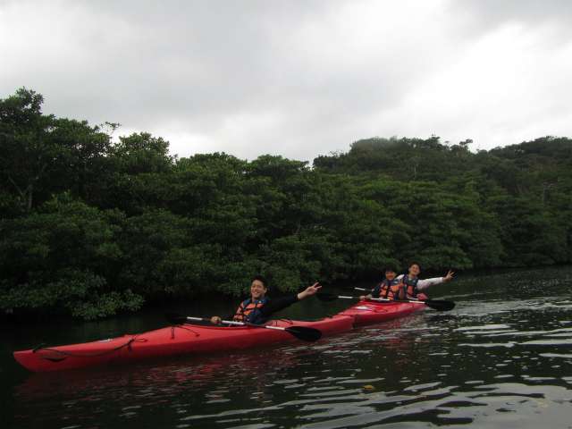 あいにくの曇空ですが。。。笑 マングローブに覆われたヒナイ川をカヌーに乗ってゆらゆら~ ジャングルトレッキングに入れば西表島ならではの植物がお出迎え~~