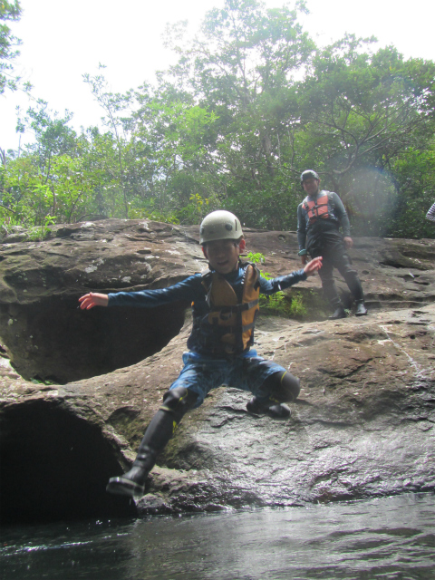 西表島で大人気のキャニオニング☆ 親子3人でチャレンジーーー☆ 最初はみなさん控えめなんです。。。しかし時間が経つにつれ回数もこなすともうアドレナリンが溢れて気持ち良い域♬ 大の字ジャンプ!! 結果中でも一番お母さんがやりきっていただいたような。。。笑