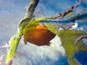 砂地ではケショウハゼのメスがちいさな2枚貝に産んだ卵を一生懸命守っているのに、、、写真を撮った瞬間逃げちゃったっっ