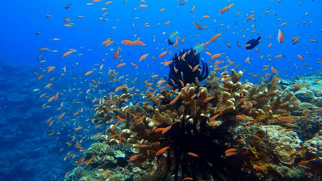 ハナゴイの群れの向こうにも実はギンガメアジの群れも♪