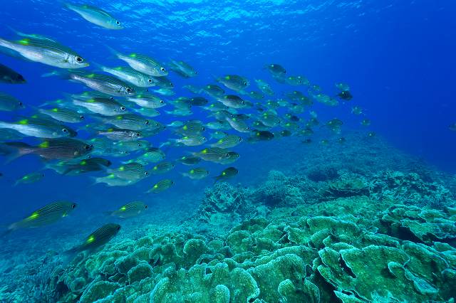 リュウキュウキッカサンゴの上にはノコギリダイ大群です。