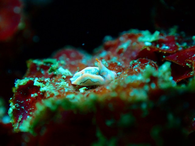 光りも最高ですが、、、壁には可愛いウミウシもいるんですよ—