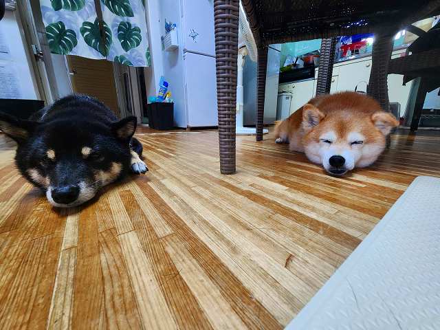 ブル-シ-ズン愛犬のまる&てんは雨でしょんぼりふて寝。