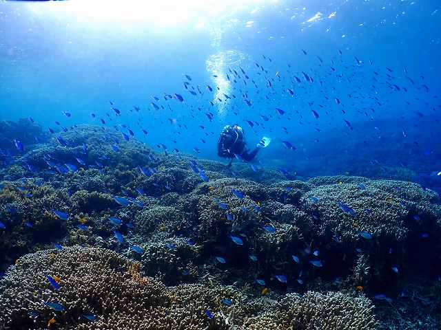 ここのサンゴ礁とデバスズメダイは太陽出てると美しい!