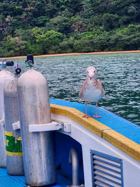 と・・皆さん透明度悪い中潜ってる時に船上で、、珍客登場!