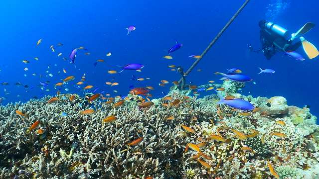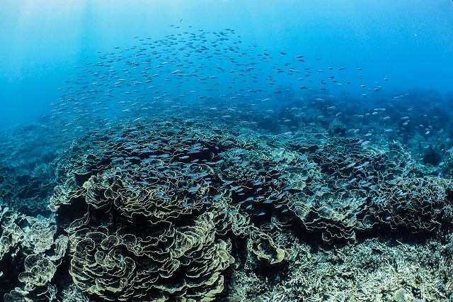 Tさんお写真は、グルクンの子供たち&リュウキュウキッカサンゴ!! 自然光でとても綺麗♪